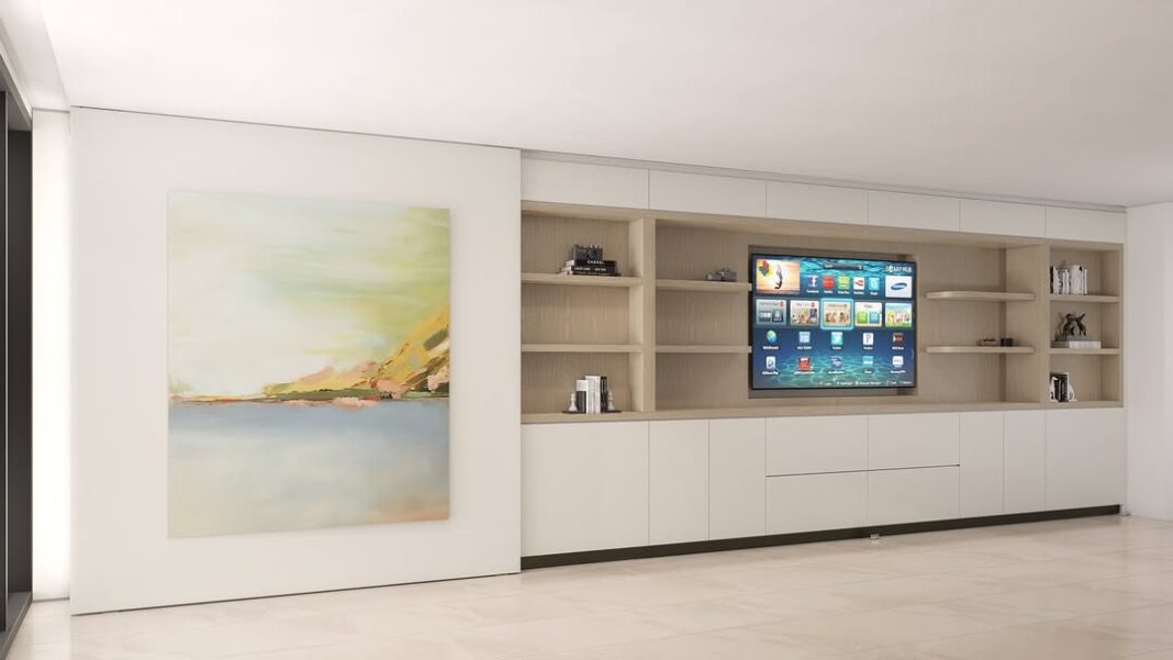 Now this is next-level innovation. A large framed artwork glides upward to reveal the TV beneath—simple motion, dramatic reveal. The “Eclipse Vertical” setup isn’t just functional, it’s theatrical in the best way.