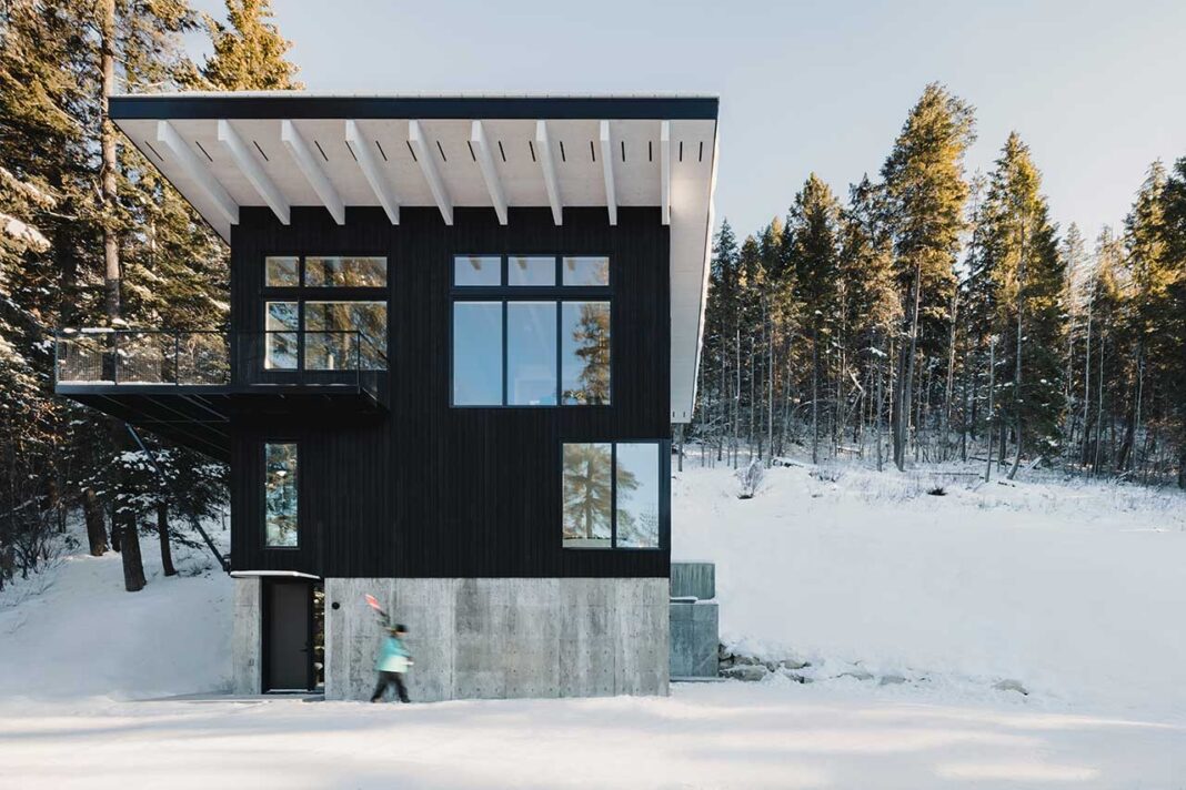 Clad in blackened wood and grounded by a solid concrete base, the three-story cabin emerges from the trees with a quiet confidence. Its vertical form allows it to capture sweeping, uninterrupted views of the Columbia River Valley and the mountains beyond – a deliberate move to make every level of the home feel closer to the treetops and sky. A sleek, shed-style roof caps the structure, echoing the slope of the terrain while maintaining a minimalist silhouette.