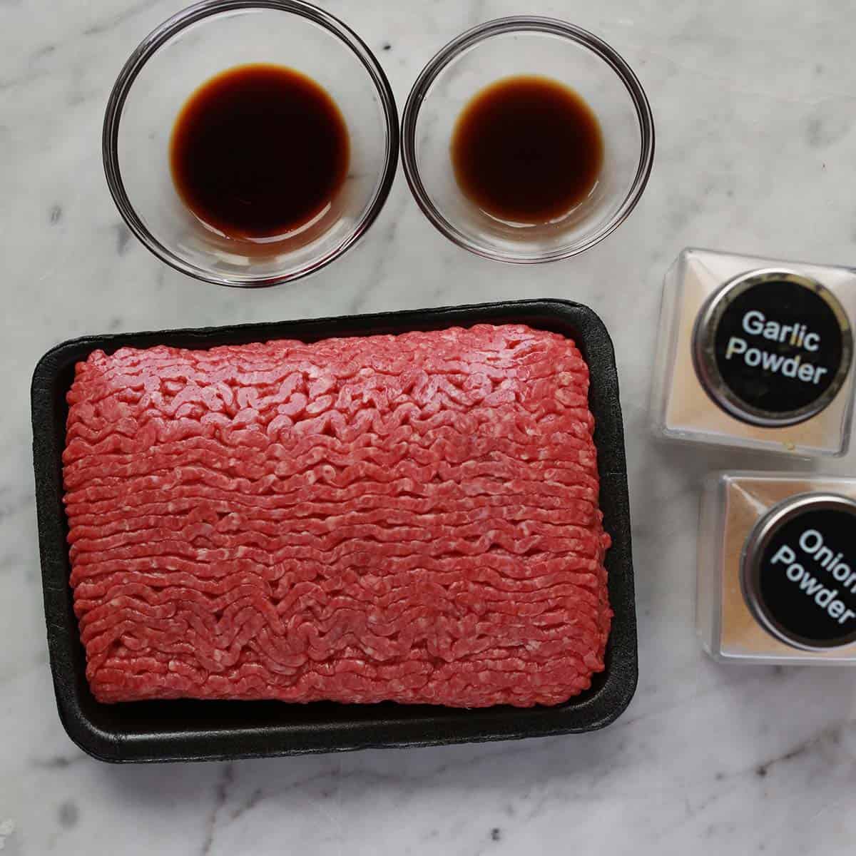 In a small to medium sized mixing bowl stir or mash together the ground meat, onion powder and garlic powder. Form four patties from the mixture.