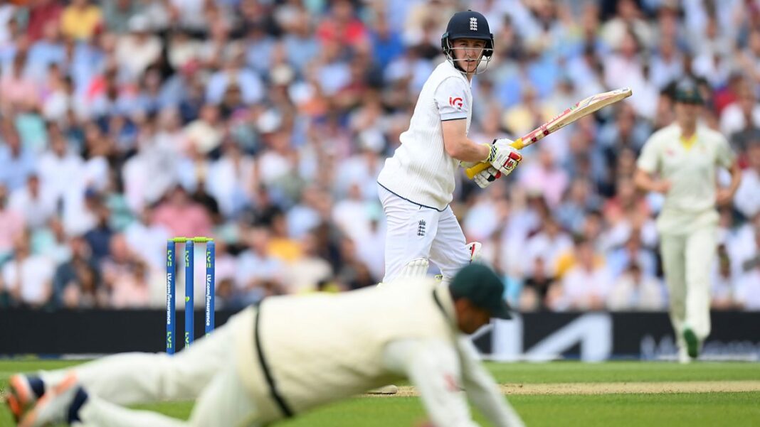 Photo: Harry Brook of England edges as Usman Khawaja of Australia fields during Day One of the LV= Insurance Ashes 5th Test Match between England and Australia at The Kia Oval on July 27, 2023 in London, England. (Credit: Getty Images)