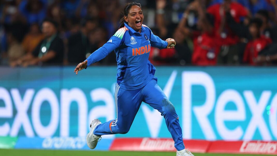 Photo: Harmanpreet Kaur of India celebrates after taking the catch to dismiss Nadine De Klerk of South Africa and lead the teams out her team to victory in the ICC Women’s Cricket World Cup India 2025 Final match between India and South Africa at Dr. DY Patil Sports Academy on November 02, 2025 in Navi Mumbai, India. (Photo by Matthew Lewis-ICC/ICC via Getty Images)