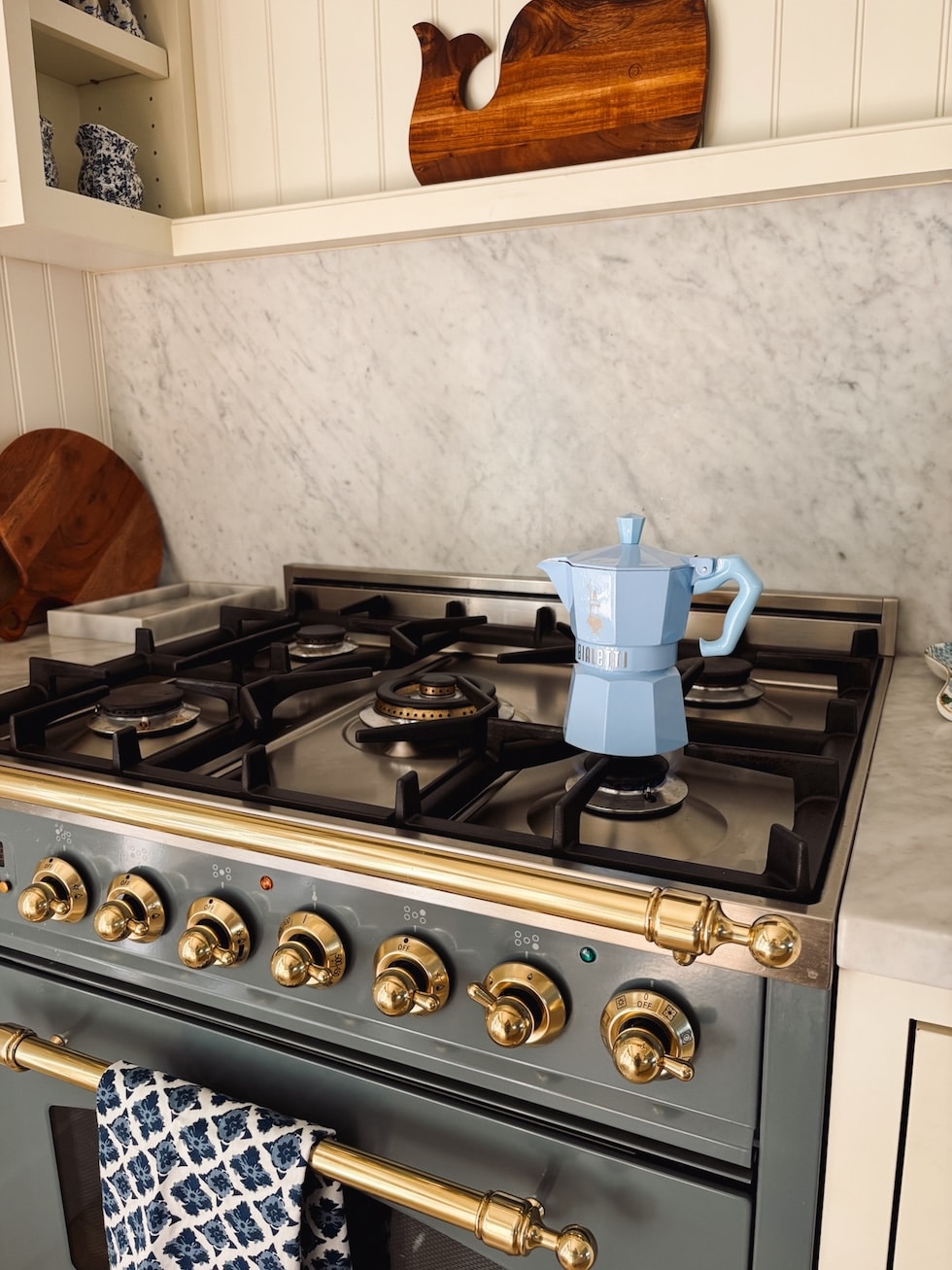 After many years of daily use, my trusty stovetop espresso pot finally kicked the can. For now, I replaced it with this smaller blue moka pot. It doesn’t brew as much as my old one, but I think it’s absolutely adorable—and just right for a cup of coffee!