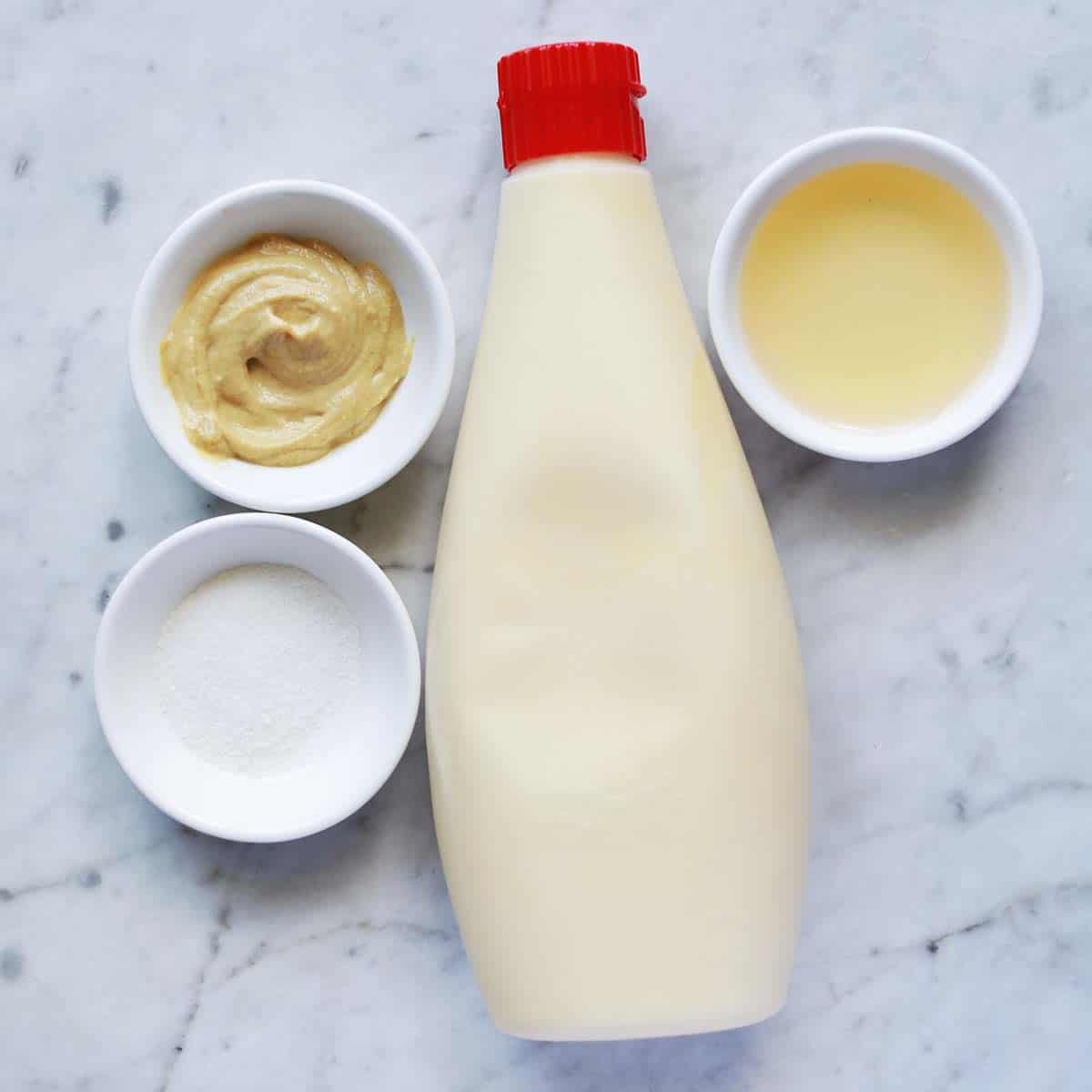 In a small bowl make the dressing by stirring together the mayo, ACV, dijon, sugar and a little salt and pepper.