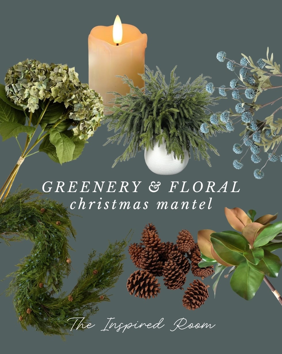 Today I wanted to share about our Christmas mantel! This year I thought it would be fun to try something a little different with floral and evergreen elements I already had. I layered a couple types of florals alongside evergreen garland, scattered pinecones, and the soft glow of (faux) candles. It was so simple to make but I think it makes such a pretty winter statement!