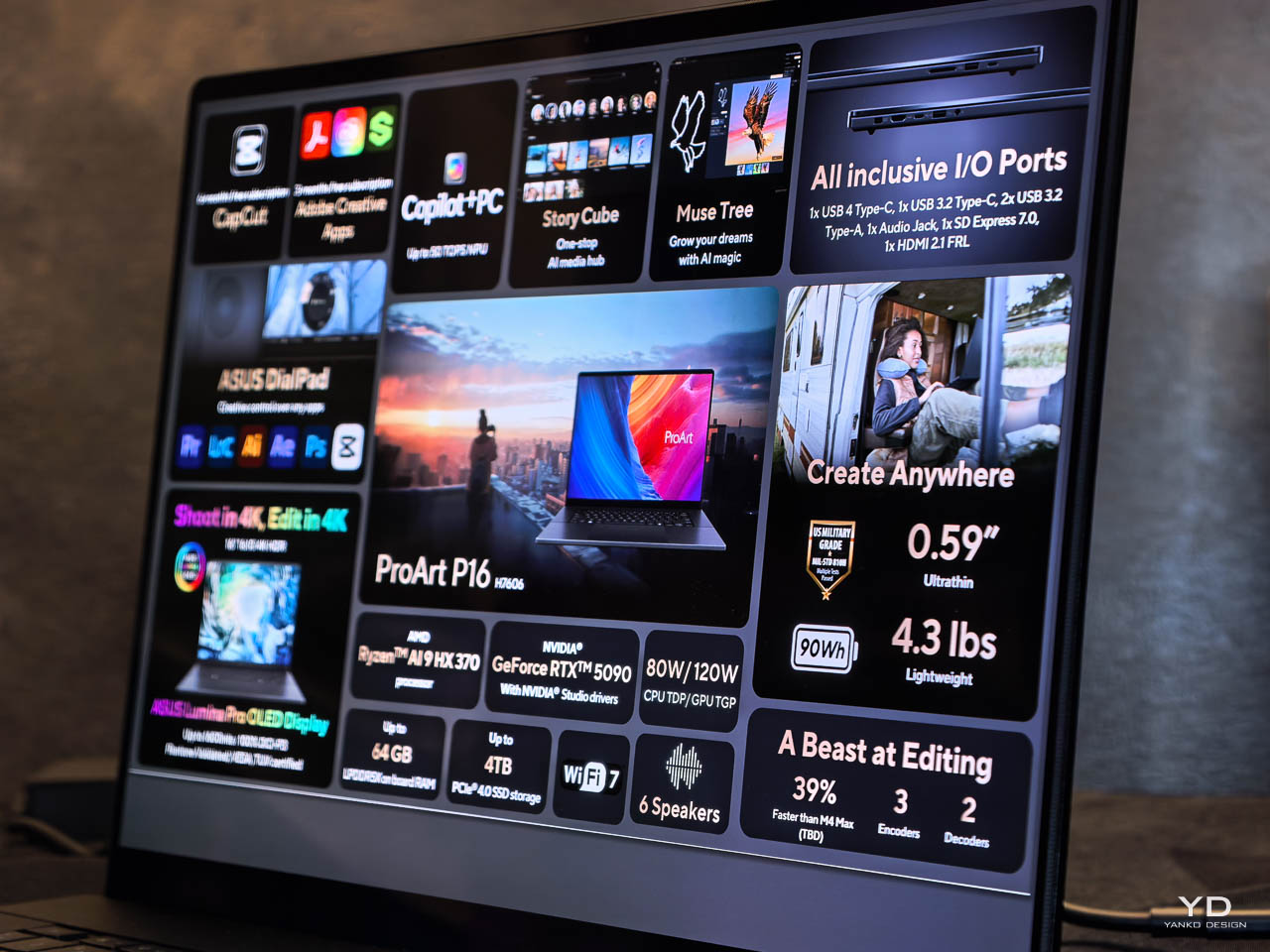 On the creator side, the ProArt P16 articulates a point of view: calibrated panels first, then quiet sustained performance, then tools. The new Lumina Pro OLED is tuned for HDR highlights without nuking black floor, and the delta-E below 1 claim held up visually in side-by-side demo footage. Specular peaks hung without blooming and fine shadow texture stayed readable. For creators, that’s utility. The Lumina Pro display hits up to 1600 nits in HDR brightness, 120Hz VRR, and the best anti-reflective coating ASUS has ever done. And as opposed to some other brands, you don’t need to pay extra to get that anti-reflective coating. You get that out of the box with every ProArt PC, and it’s not a matte coating. So you don’t lose any of that crispness and sharpness. It’s about diffusing reflections without muddying the image.