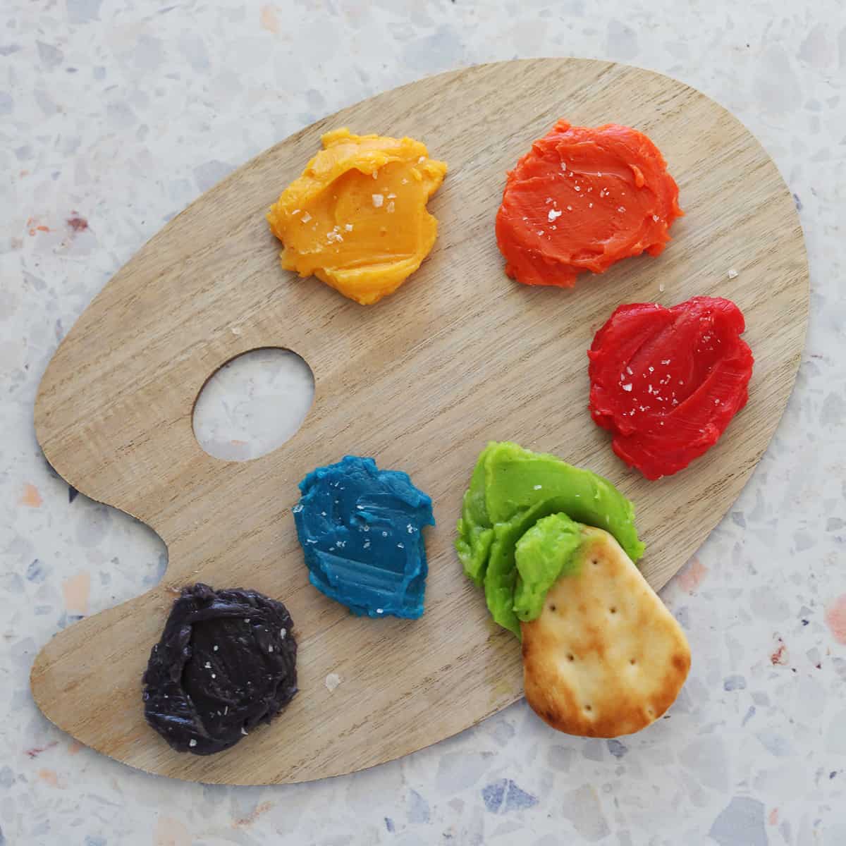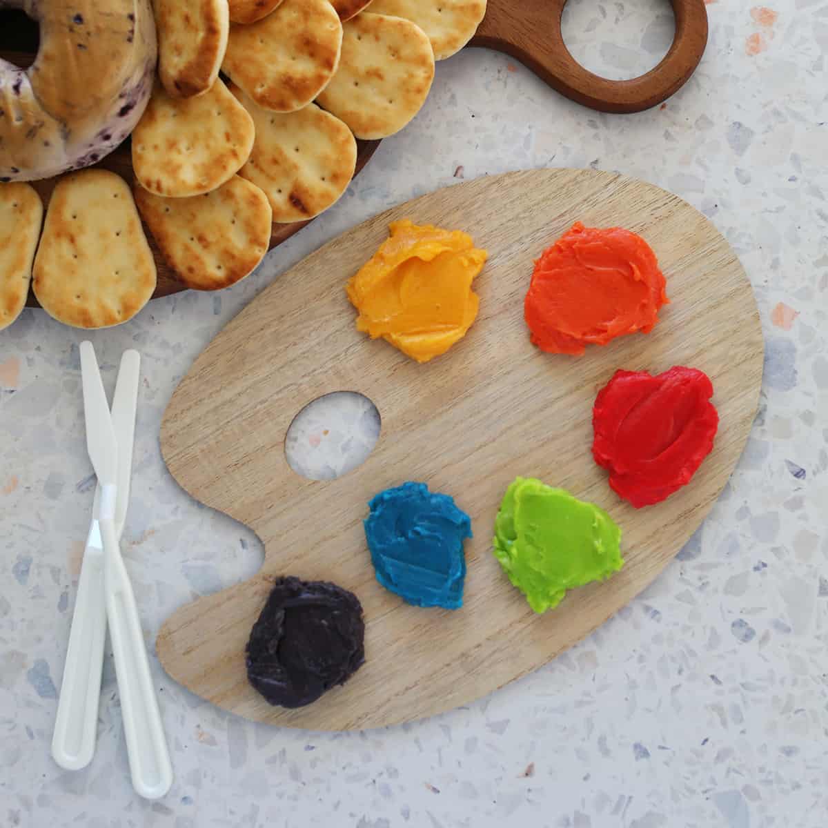 There are so many different ways to create a butter board! I decided to take some of the honey butter from this recipe and add a few drops of food dye to create this artist palette-inspired butter board.