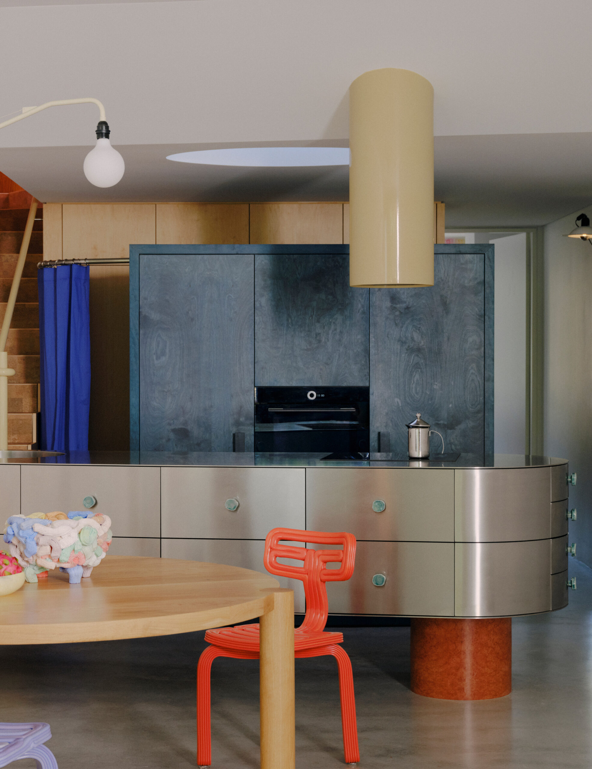 The kitchen was reconfigured to face garden views, offering a calming balance to the sculptural stainless-steel island bench and playful furniture selections. Storage is now cleverly hidden in a timber ledge forming a ‘catwalk’ up to the staircase, as the blue-stained timber joinery also doubles as a ‘dressing room’ with added wardrobe space.