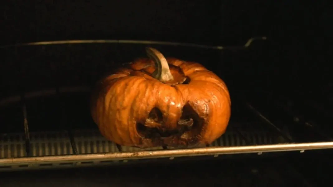 You basically gut and carve the pumpkin as you normally would, then you bake it inside a toaster oven, drying it out for longevity and charring and warping it for a disturbingly scary jack-o’-lantern.
