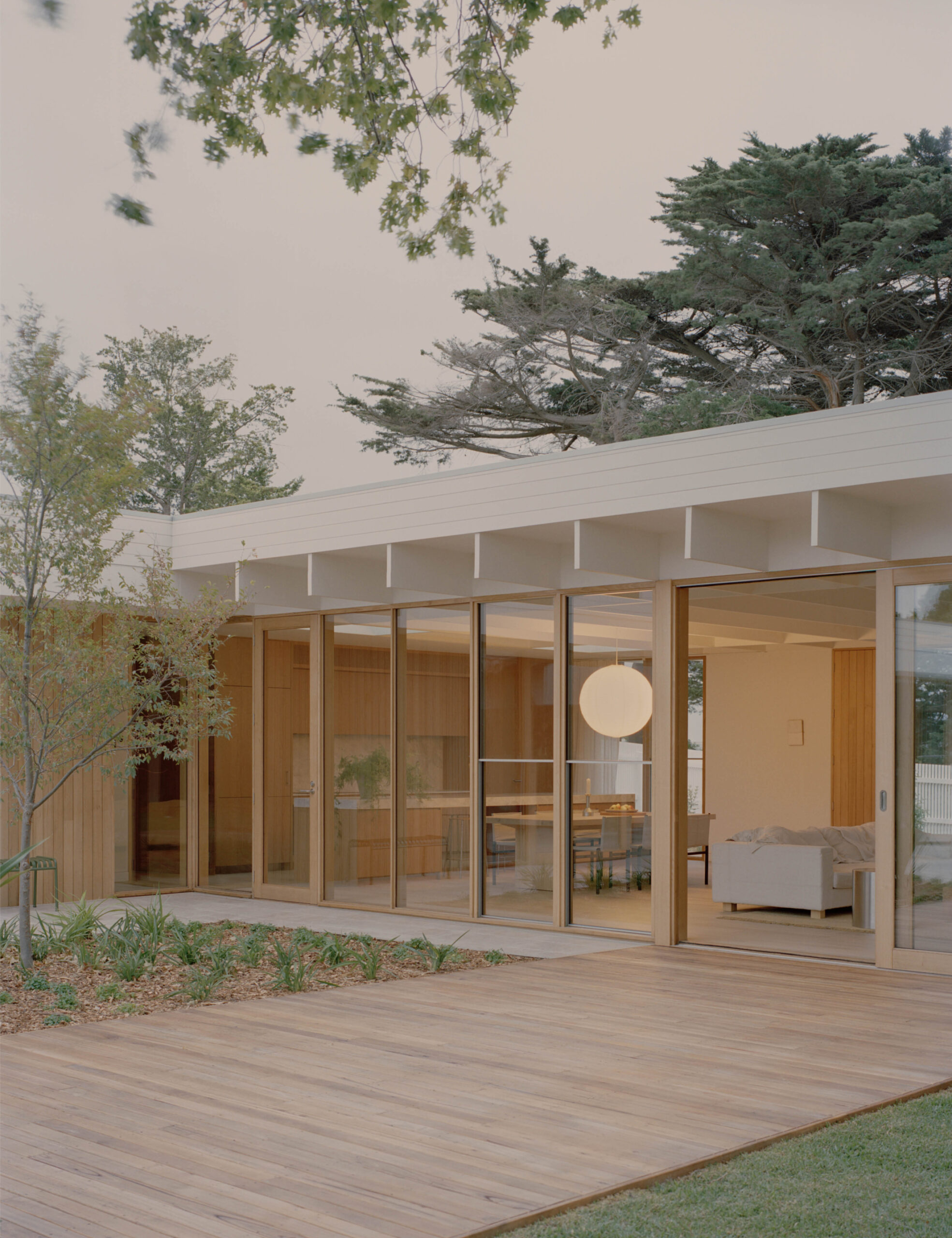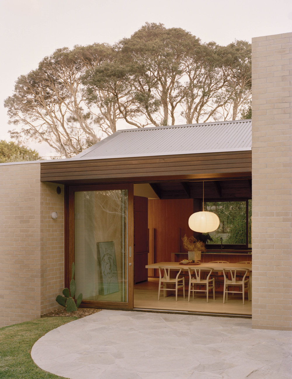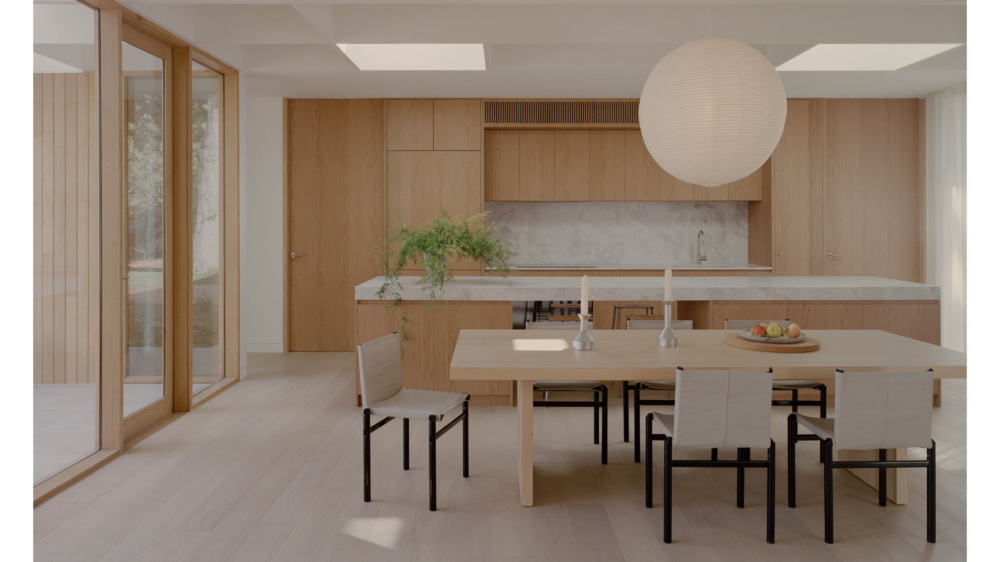 A Modern Interpretation Of A Classic Mid-Century Beach Shack. Rice Paper Shade Large pendant by HAY. Dining table by Mark Tuckey. Mastro Chairs by Afra and Tobia Scarpa from Castorina. Candle holders by Fabien Cappello. Photo – Tasha Tylee. Styling – Tatjana Melchiorre.