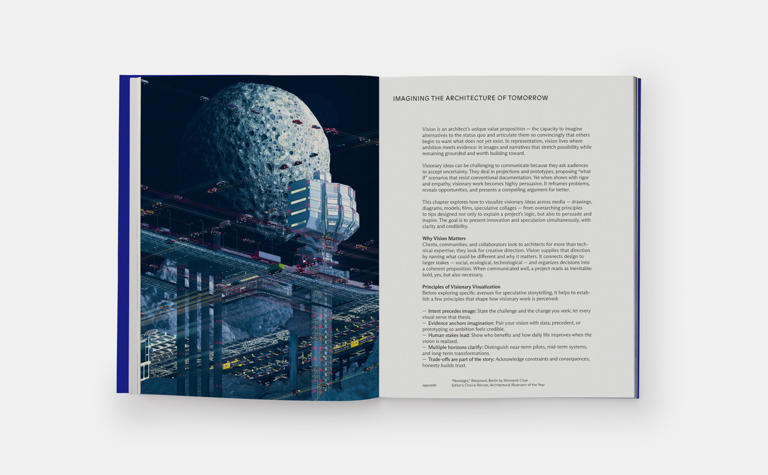 Visualization, the book argues, is not a one-off task but an ongoing habit. Readers are encouraged to maintain living archives of sketches, in-progress screenshots, mock-ups and field notes — building a visual memory that can be activated when opportunities arise. Whether preparing for a presentation, a publication or an awards submission, this archive becomes a powerful resource.