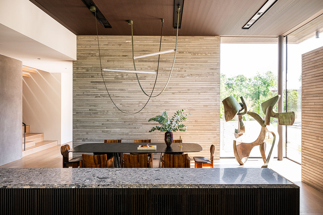 The furnishings further this dialogue between modernist lineage and contemporary sensibility. Instead of defaulting to the familiar icons of mid-century modern design, Rice curated a collection that blends rare vintage pieces with limited-edition works by contemporary designers. Sculptural lighting, carved wood chairs, and stone tables enrich the interiors with history and personality while remaining in harmony with the home’s muted chromatic atmosphere. Each piece contributes not only function but also a unique sense of self, reflecting the clients’ passion for the unexpected design.