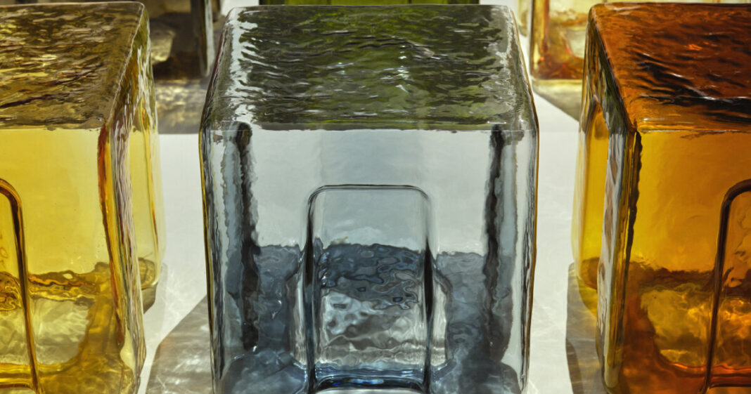 The functional objects by design brand 6:AM are blown-glass cubes, each one unique in tone and surface detail, and the studio’s color palette of ten shades includes green, amber, clear, grey, and violet, to name a few. No shade stands out, but they gleam in harmony, even refracting the light and playing with shadows to mimic the surface of the sea and the waves of the ocean. Upon a closer look, the top of these Murano blown-glass stools at the Bottega Veneta Summer 2026 show mirrors the calmness of the sea, away from turbulence.