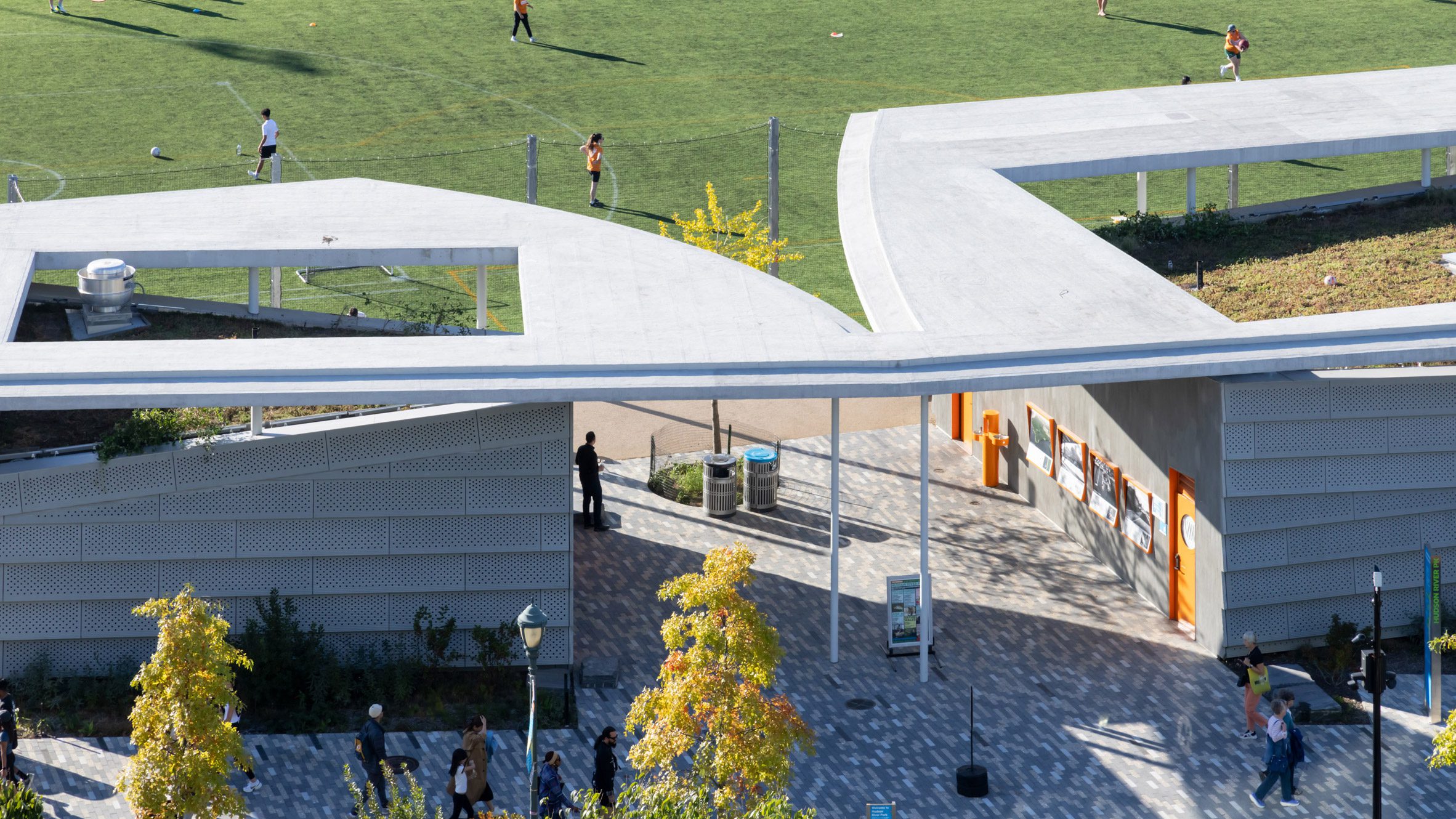 The pavilion sits on the park’s highest point with views of the surrounding sports fields, passive playspaces, neighbourhood and nearby Palisades Park.