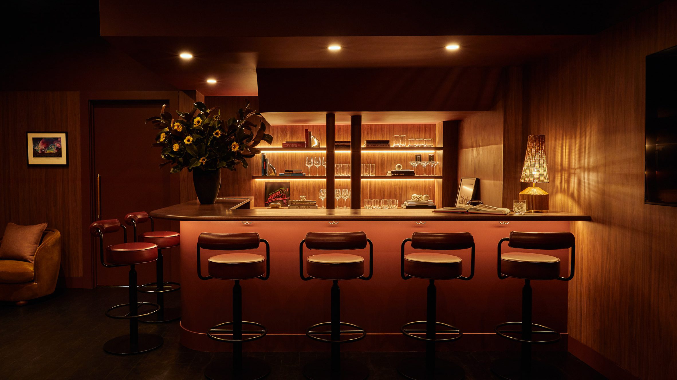 In the speakeasy, the palette shifts to darker burgundy tones complemented by richly grained millwork, evoking a sense of intimacy.