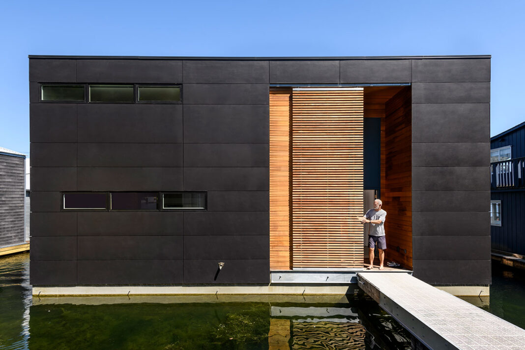 Replacing a decades-old houseboat that once occupied the canal slip, the project began with a new reinforced concrete float – a foundation that provides long-term stability and modern utility access for plumbing and electrical systems. The home itself was built in Dyna’s Ballard shipyard and carefully towed into place, a reminder of the precision required for floating architecture in Seattle’s waterways.