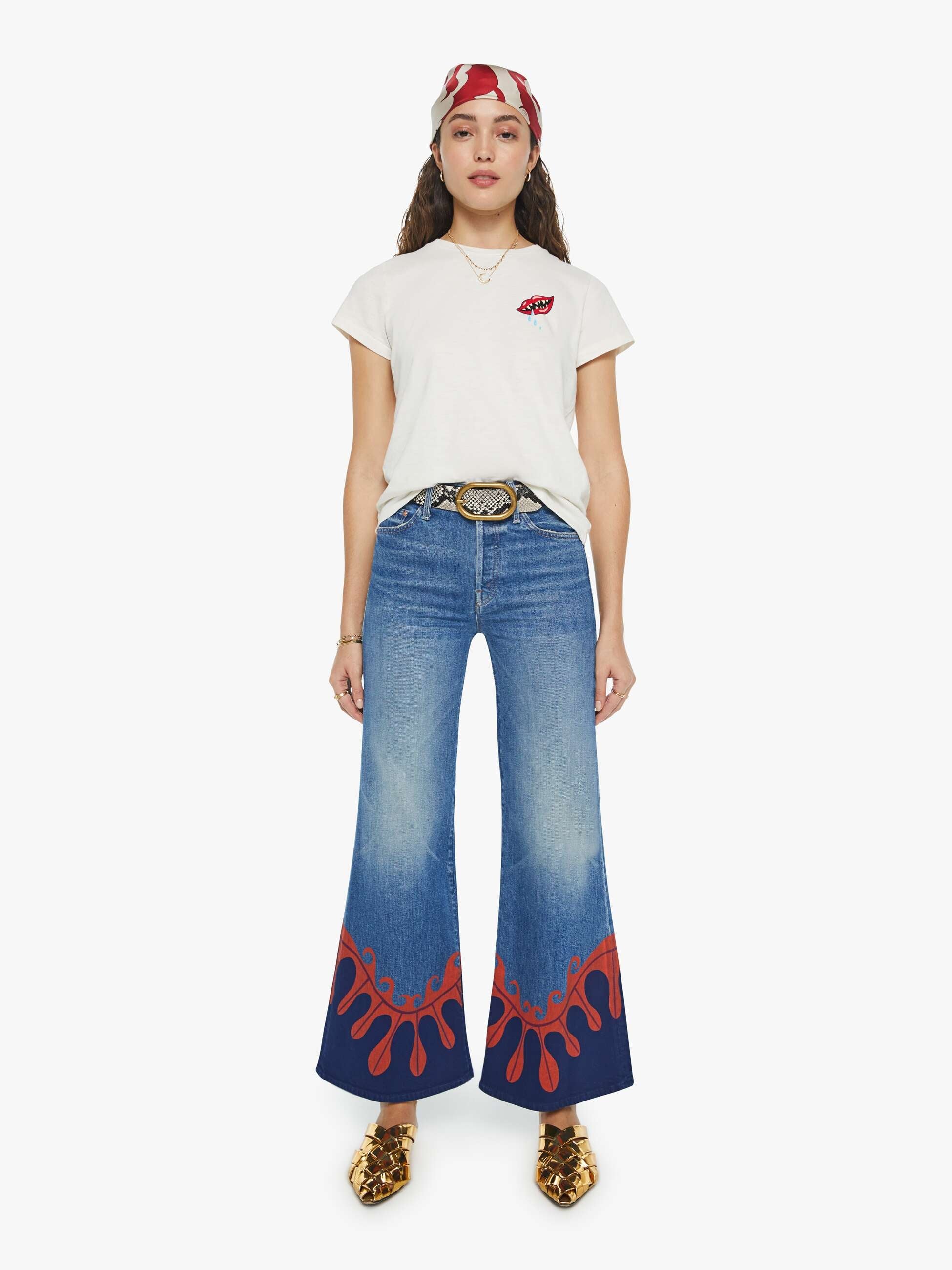 California cool and Italian flair are coming together in the just-dropped Mother x La DoubleJ capsule collection. The 30-piece line brings La DoubeJ’s maximalist, ’70s-style prints to Mother’s effortless denim pieces, such as the Half-Pipe Ankle barrel jeans that are covered in illustrated dragonflies, a denim jacket with an embroidered tapestry of a goddess on the back, and a pair of flares with wave details at the hems. The collection isn’t all about denim either; also discover graphic tees, boho blouses, and flowy kaftans. Prices range from $130 to $1,290.