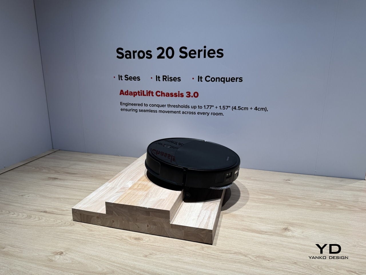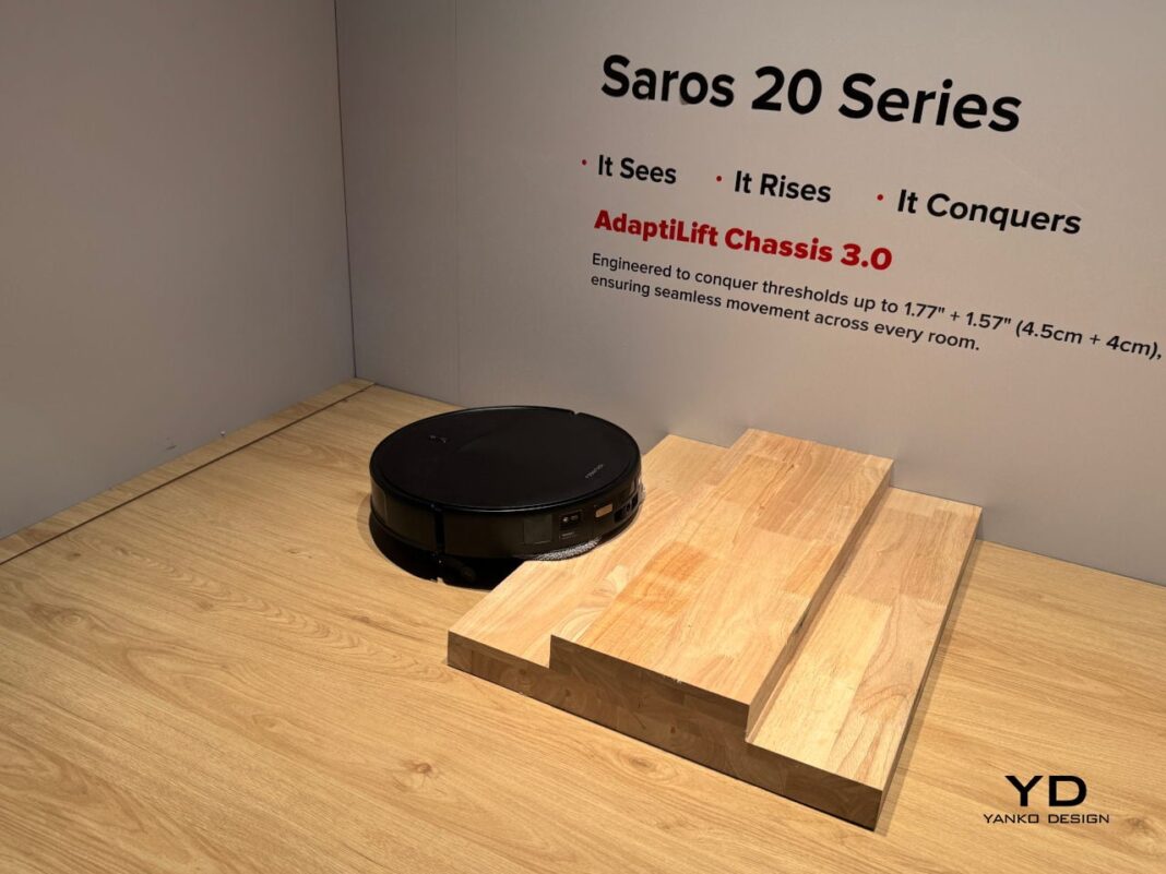 AdaptiLift Chassis 3.0 is the mechanical side of that intelligence, lifting and adjusting three wheels independently to cross double-layer thresholds up to 8.5 cm tall, climb onto carpets as thick as 3 cm, and free itself when stuck. Layouts where balcony lips, thick rugs, and split-level transitions trap lesser robots become manageable terrain. Saros 20 learns the best way to cross each threshold and remembers it, treating obstacles as solvable puzzles rather than dead ends.