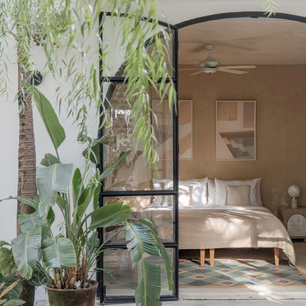 The aesthetic in the communal spaces is more eclectic than in the bedrooms, reflecting the more indoor-outdoor nature of these spaces, both of which feature arched glass doors.
