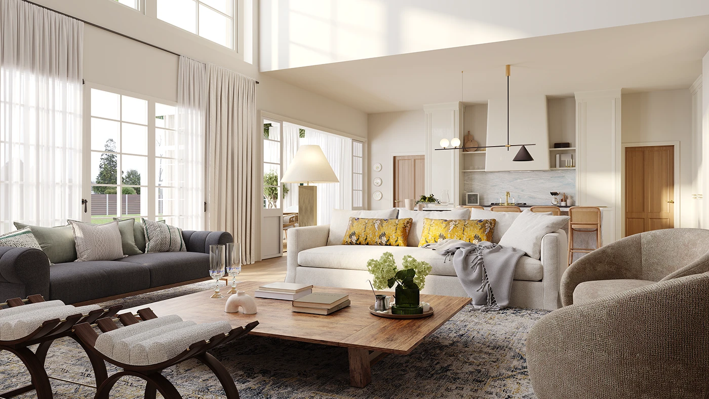 The living area is designed to feel open, calm, and deeply comfortable. Soft neutral sofas anchor the room, while curved lounge chairs add movement. Natural light pours in through tall windows, highlighting the warm wood floors and layered rugs underfoot.