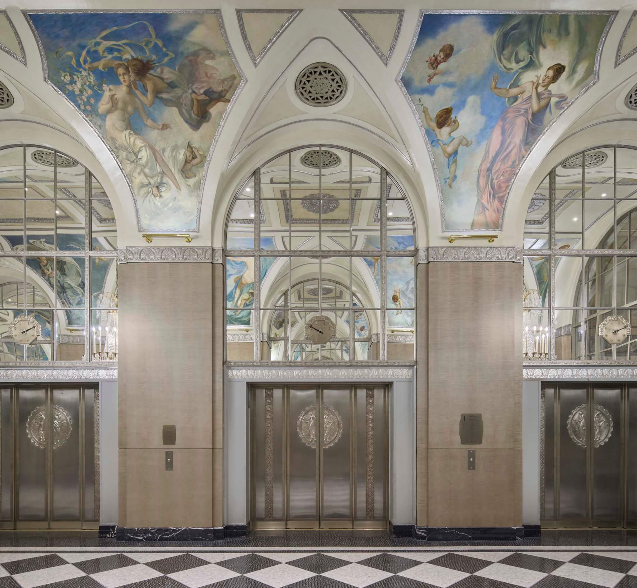 Landmarked spaces on the two floors above have also been thoroughly restored. The Silver Gallery, inspired somewhat by the Hall of Mirrors at Versailles, has been scrubbed, with metalwork and Harewood paneling replaced. It features 16 Edward Emerson Simmons ceiling murals depicting the months and seasons, which were relocated from the prior hotel building. During the restoration, specialists at ArtCare Conservation discovered that these murals included additions that matched previously darkened originals. They restored the entire mural to its original coloring.