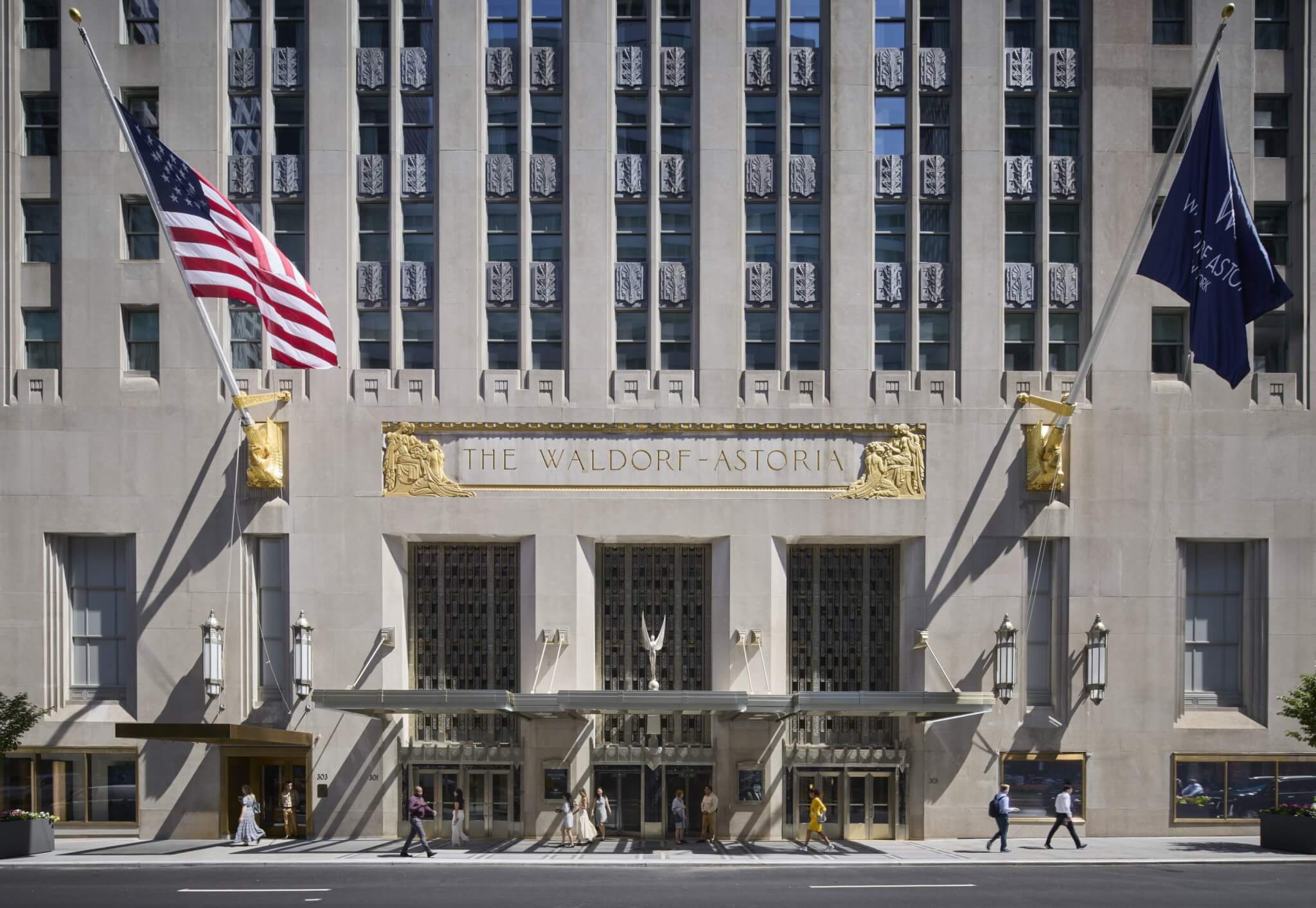 The facade has been comprehensively restored. Decorative spandrel panels that had previously been cruelly ruptured for air-conditioning units were recreated by artisans in the renovation. Restoring the hotel’s 5,600 windows to their original, sleeker dimensions helps shed some bulk. About 800 upper-floor windows were heightened to allow larger pathways for daylight on the residential levels. Base limestone was polished up, as were bricks. Those were re-created where needed in their original color: Waldorf Grey.