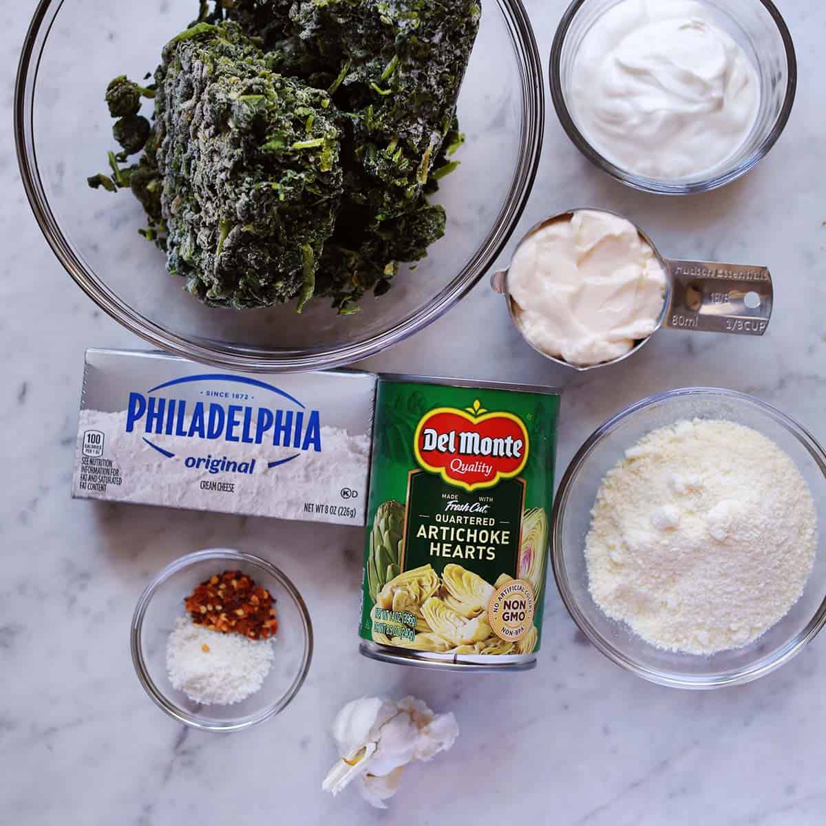 Thaw and drain the frozen spinach. If it’s not already chopped then finely chop. Drain the artichoke hearts and cut into small pieces. Mince the garlic.