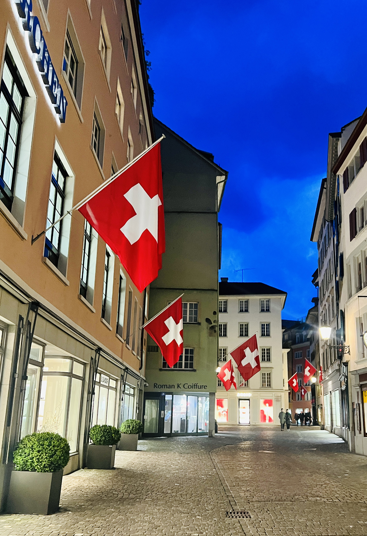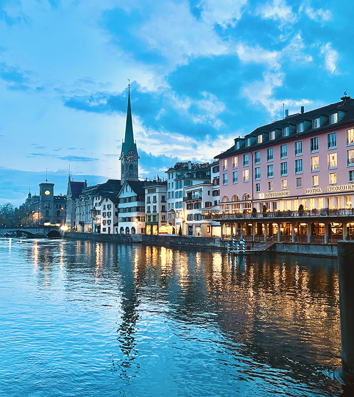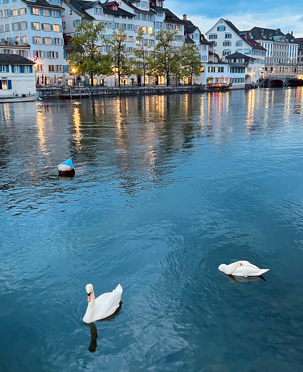 In the evening, my friends and I would stroll up and down the banks of the Limmat River, the light was perfection. Zurich is lovely by day, but in my experience, even lovelier during the evening during a twilight walk when the color of the sky and the lights reflecting off the Limmat River make you feel like you’re walking in a painting.