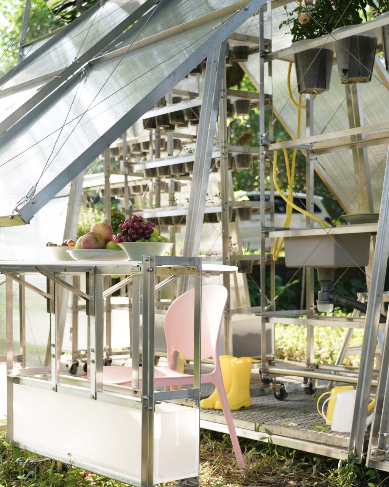 Picture this: a steel A-frame structure wrapped in polycarbonate panels that can hinge open using tension cables suspended from the top of the frame. When the sides are closed, you have a microclimate perfect for growing potatoes, green peppers, lettuce, bok choi, and various herbs. When you pull those cables and the walls lift up, suddenly you’ve got an airy pavilion ready to host a dinner party or a community workshop.