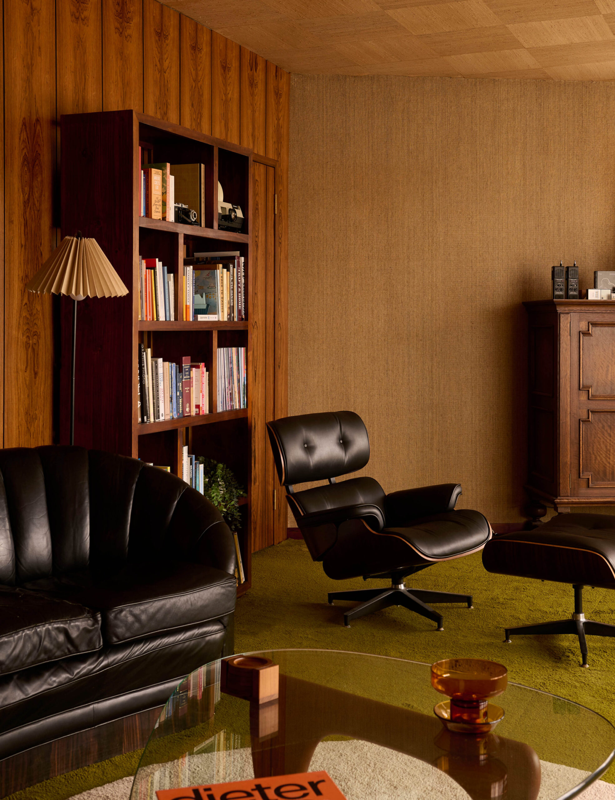 Sarah has styled the space with mostly secondhand pieces to enhance the green carpet, timber panelling, and wallpapered feature walls. A retro hairdryer and circa 1970s light-up mirror look right at home in the tiled bathroom, as do the matchstick boxes and board games on display in the lounge room.