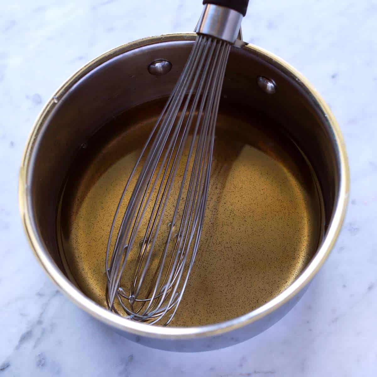 Over medium/high heat whisk the sugar until it’s fully dissolves. The water should get hot during this process but you do not need to reach a boil.