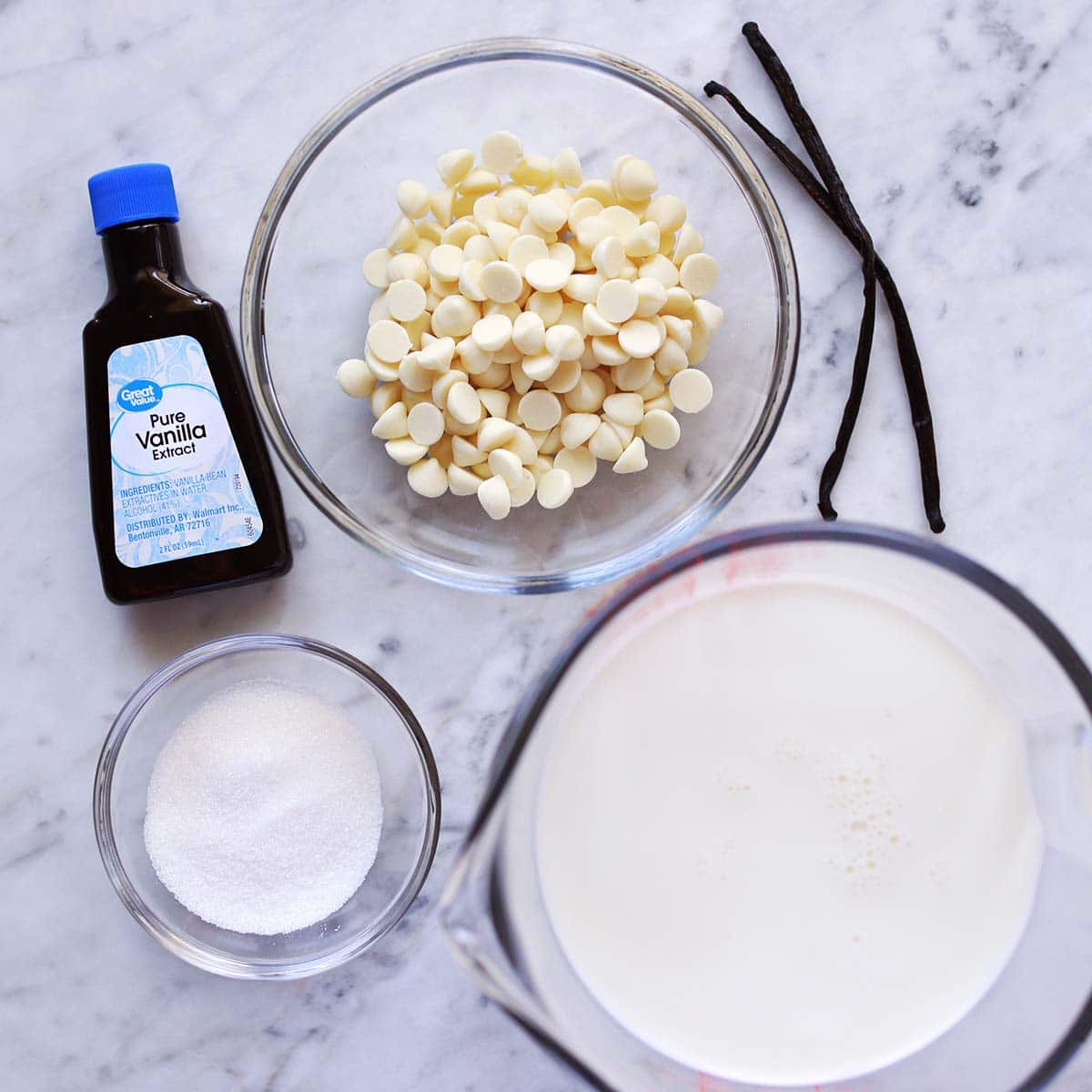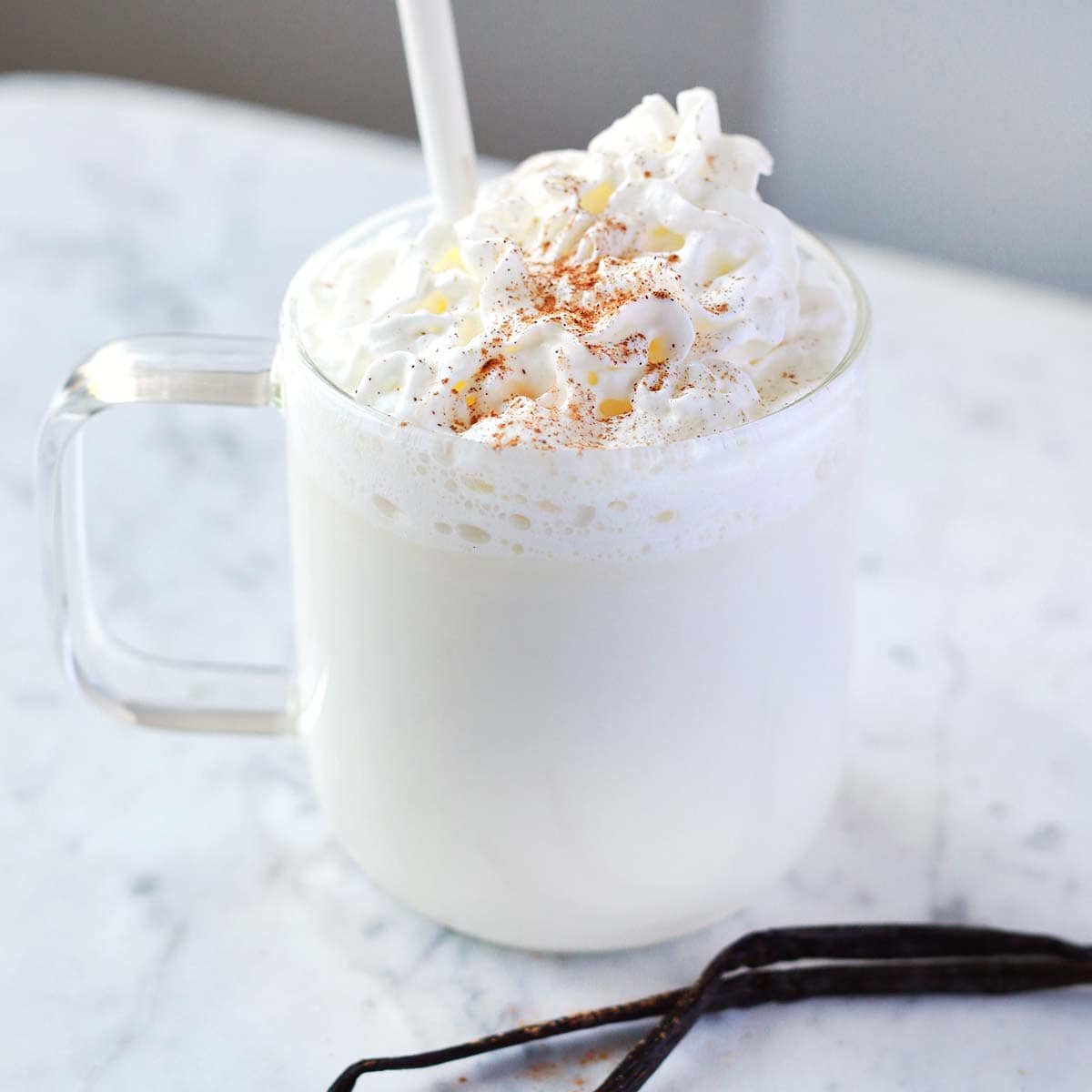 This white hot chocolate is made from milk, sugar, white chocolate chips or a bar and vanilla. That’s all you need and less than 10 minutes to make this! I recommend topping with whipped cream or marshmallows. I like a sprinkle of pumpkin pie spice on top but another fun addition would be a candy cane.